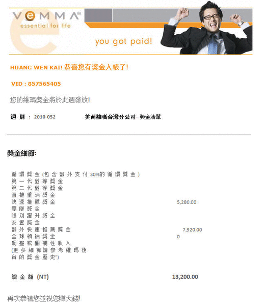 狂賀! 狂賀! 經過上個月的快馬加鞭, 本週的收入突飛猛進啦! Kevin加入VEMMA才三個月, 週薪已經破萬囉!!!